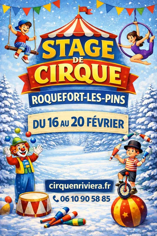 A colorful, wintry poster announcing a children's circus camp in Roquefort-les-Pins, with illustrations of young artists practicing juggling, trapeze, balance and aerial hoop under a big top, in a festive and family atmosphere.