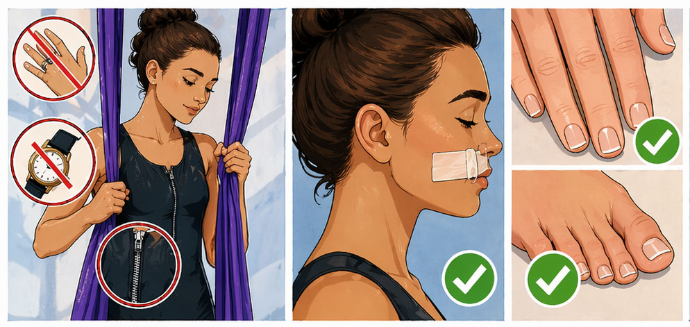 - Rimozione del metallo: è severamente vietato indossare anelli (anche lisci), orologi, cerniere o velcro mentre si indossa il gioiello. Qualsiasi piercing non rimovibile deve essere fissato con nastro adesivo medicale.