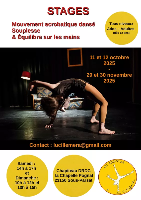 💫 Circusworkshop in Sous-Parsat (Creuse) — Doe mee aan een weekend vol oefeningen met acrobatische dansbewegingen, flexibiliteit en handbalans onder de grote tent van de vereniging Des Racines et du Cirque.