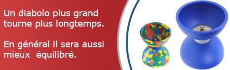 Hoe groter de diabolo, hoe makkelijker deze te gebruiken is, omdat deze een betere traagheid heeft. Let er wel op dat u, afhankelijk van uw lichaamslengte, niet iets kiest dat te zwaar is. Onder de middelgrote diabolo's zijn dit enkele modellen die uitstekend geschikt zijn voor beginners: de Jester (eerste prijs, uitgerust met een brede as). De Radiant (zeer kleurrijk en robuust). Jazz (uitgerust in de meeste circusscholen). Van de grote diabolo's zijn de Finesse, de Circus en de Taibolo de beste modellen. Als je een klein postuur hebt :-) is de Finesse het lichtst en zeker het meest wendbaar voor een kleine beginner! Veel plezier met jongleren!