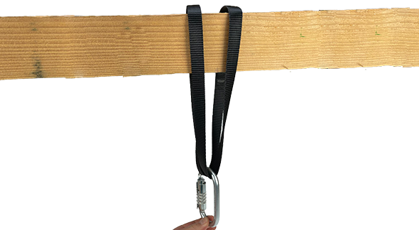 Ci-dessous, un exemple d'utilisation d'un anneau cousu pour créer un point d'ancrage. Le mousqueton n'est pas inclus avec l'achat de l'anneau cousu, il est montré uniquement pour la mise en scène de l'anneau cousu. Pour ce type d'instalation il vous faut pouvoir passer l'anneau cousu au dessus de votre poutre. Si vous n'avez pas d'espace au dessus de votre poutre, nous avons une autre méthode que vous pouvez mettre en place avec un plateau d'ancrage.