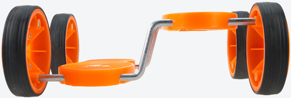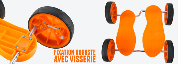 Le Fun Stepper est constitué de quatre roues en plastique et de deux axes en métal courbés reliant chaque paire de roues et attachant solidement les pédales.
