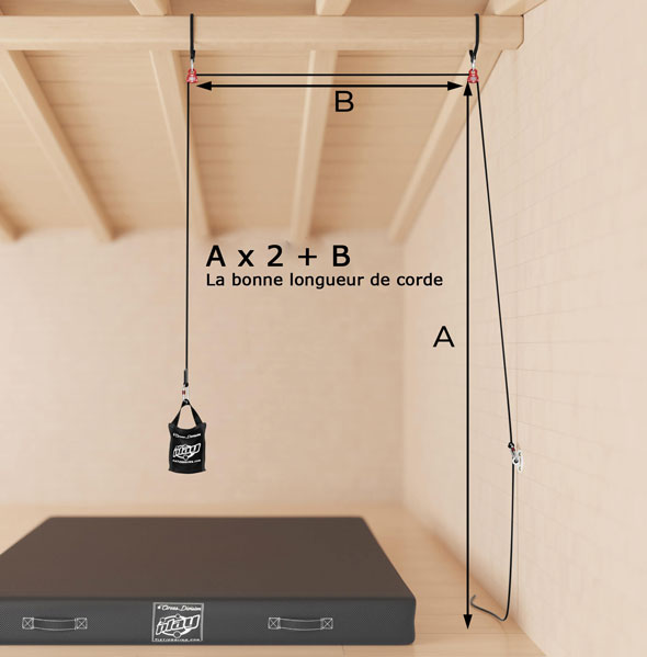 La longueur de la corde doit être précisée au moment de votre achat en la choisissant parmi les options. Pour déterminer la bonne longueur de corde, il est bon de multiplier la hauteur du point d'ancrage par rapport au sol par 2 et d'ajouter sa distance au mur auquel la plaque de sol est fixée : A x 2 + B.