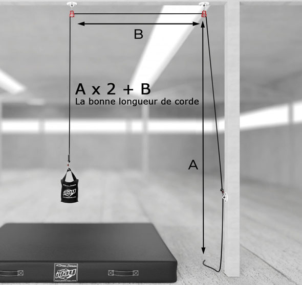 La longueur de la corde doit être précisée au moment de votre achat en la choisissant parmi les options. Pour déterminer la bonne longueur de corde, il est bon de multiplier la hauteur du point d'ancrage par rapport au sol par 2 et d'ajouter sa distance au mur auquel la plaque de sol est fixée : A x 2 + B.
