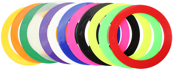 Un beau panel de couleurs pour ces anneaux du fabricant Mister Babache. En comparaison, les couleurs des anneaux Play sont plus fluos et sont réactifs aux UV, celle de Mister Babache sont moins flashy. Play réalise aussi toute une série d'anneaux dans des tons pastels.