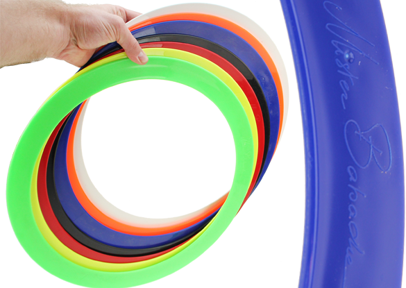 Anneaux à jongler en plastique rigide fabriqués par Mister Babache. Ils permettent une jonglerie plus aérienne/aérée. Leur taille imposante n'est peut être pas idéale pour les débutants, mais plus pour les jongleurs qui ont déjà de bonnes notions en jonglerie. Il faudra en effet les envoyer plus haut, ce qui donne une sensation de légèreté à sa jongle si on fait une comparaison avec des anneaux en 32cm qui permettent un style plus dynamique.