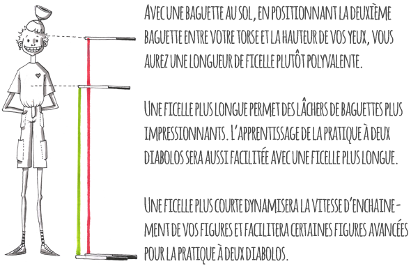 Pour faire du diabolo, un point important est la longueur de la ficelle. La longueur dépend de votre taille et aussi de vos préférences. Il n'y a pas de longueur type !