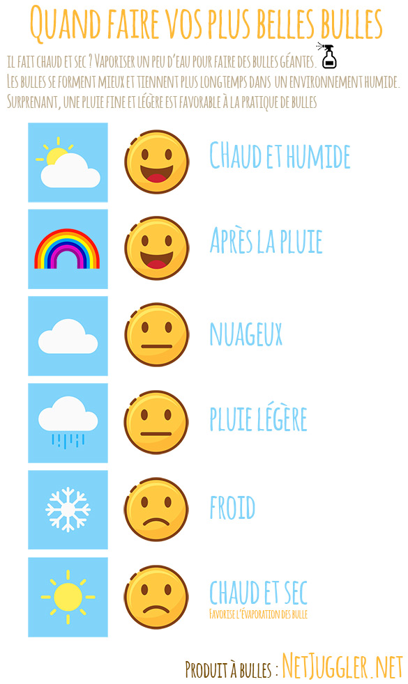 Nos produits à bulles fonctionnent avec presque toutes les météos sauf lorsqu'il y a un vent fort. Il y a tout de même des conditions météo avec lesquelles vous obtiendrez des résultats plus performants. On vous a réalisé ce petit visuel qui résume un peu tout ça :-)
