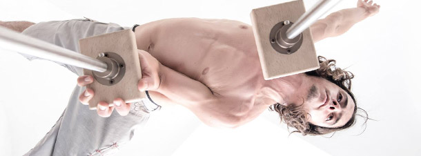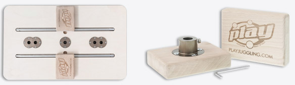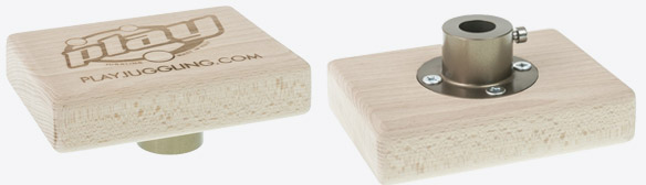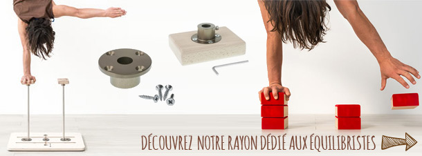 Les deux embases basses doubles sont fixées à la base en bois, ce qui vous permet 3 différents écarts de cannes allant de 34cm à 38cm. La troisième embase est centrale. Elle permet une position d'équilibre centrale sur une main. Vous pourrez acheter en option un kit compatible équipé d'un roulement à billes pour réaliser des équilibres tournants sur 360° (non compris dans ce kit).