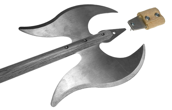 Cette hache a double lame ressemble étrangement à un Phoenix. Voici l'accessoire idéal pour vos spectacles médiévaux.