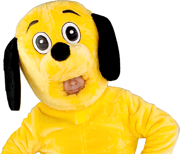 Costume de mascotte chien jaune fabriqué en France. Lavable en machine, personnalisable et idéal pour vos animations et événements.