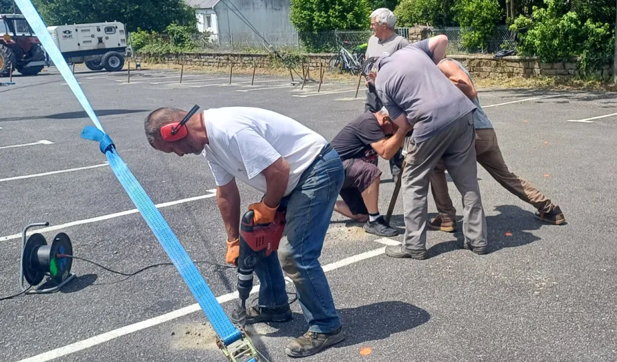 « On a dû monter sur de l'enrobé. La solution était de percer. On loue un perforateur, mèche de 40 mm sur 80 cm de profondeur. Et là , surprise : sous l'enrobé, une dalle en béton armé d'une ancienne cour d'école. On a dû faire chaque trou à la main, sur seulement 20 cm de profondeur. On a doublé le temps prévu, mais la structure a tenu. Un montage épuisant, mais extrêmement satisfaisant. »