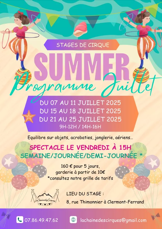 La Chaîne des Cirques propose des stages de cirque à Clermont-Ferrand pendant tout le mois de juillet 2025. Ouverts aux enfants de 4 à 14 ans, ces stages permettent de découvrir ou approfondir les différentes disciplines circassiennes : jonglerie, équilibre sur objets, acrobaties, aériens, et bien plus encore !