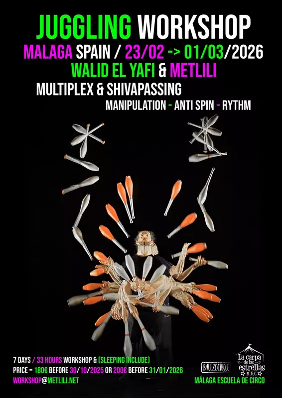 Venez vivre une expérience unique de jonglerie à Málaga 🇪🇸 avec le Juggling Workshop 2026, animé par Walid El Yafi et Raphael Caputo (Metlili).