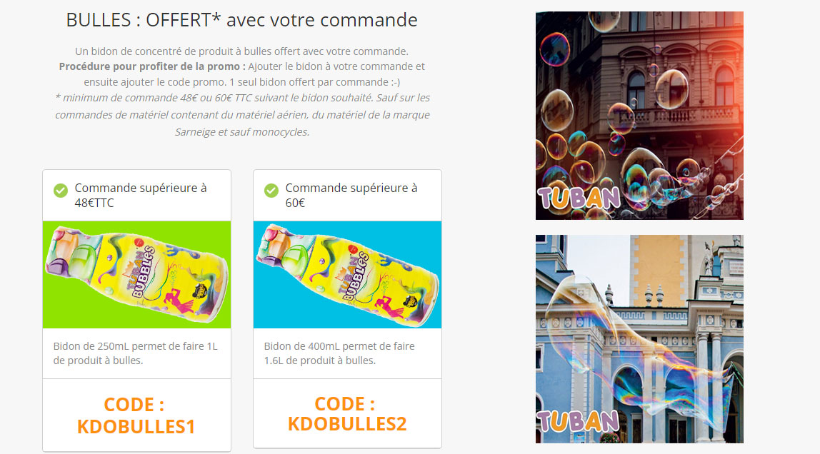 Produit à bulles Tuban en bidons de 250mL. Chaque bidon est équipé d'un double bulleur.